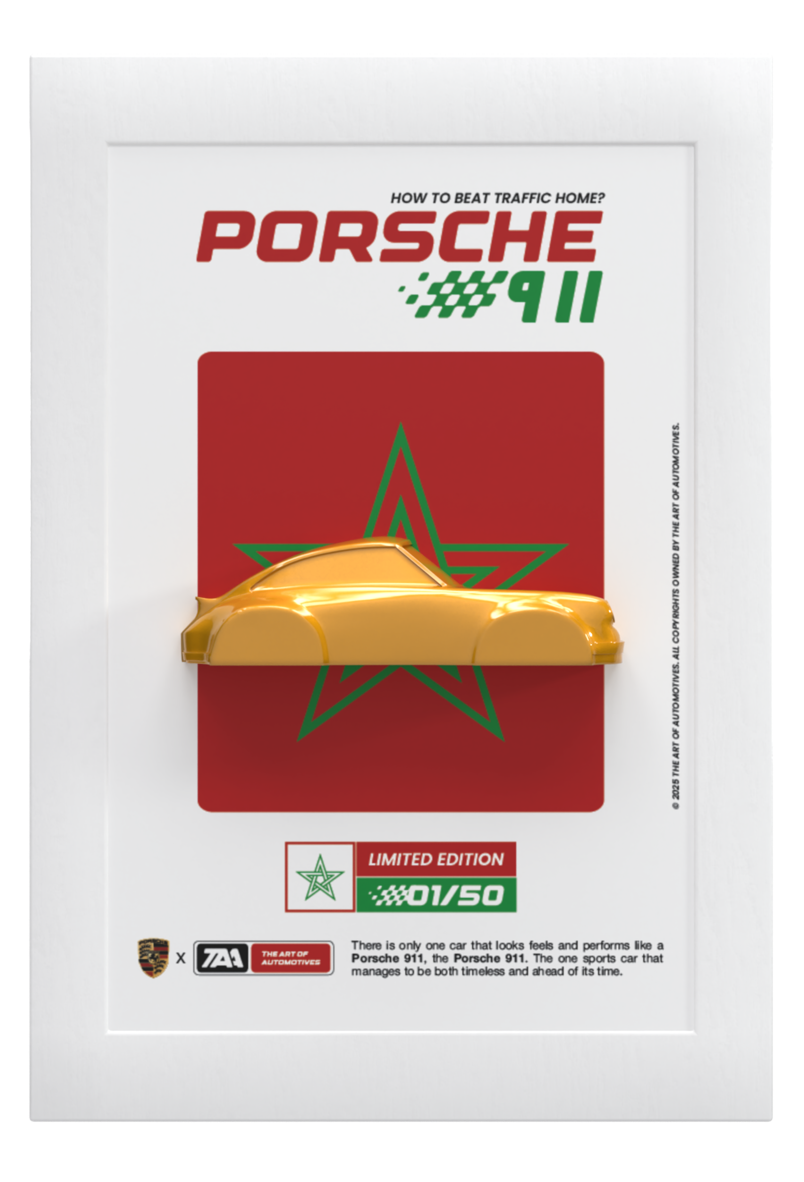 Discover our Moroccan exclusive 3D Porsche 911 poster (13×17 cm) in a crisp white wood frame, limited to just 50 numbered editions. Perfect for car enthusiasts and collectors.